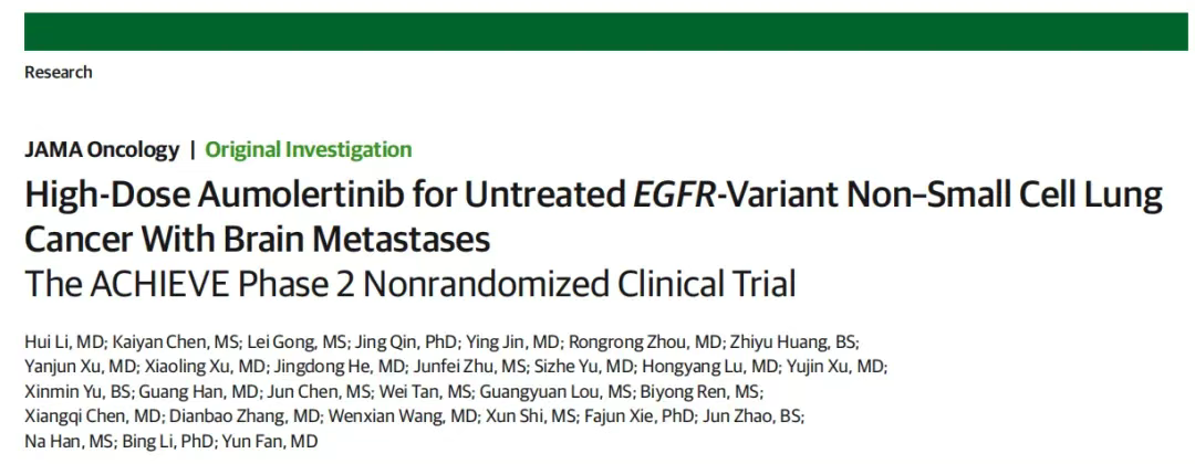 该研究名为ACHIEVE研究,由浙江省肿瘤医院范云教授团队牵头,是一项在中国10个中心开展的多中心、单臂、非随机Ⅱ期临床试验,皆在评估高剂量阿美乐®在未经治疗的EGFR突变转移性NSCLC伴脑转移患者中的有效性和安全性。